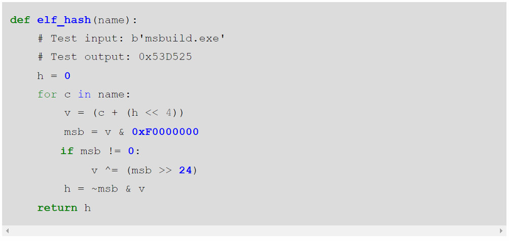SUNSPOTは初期化後、開発ツールMicrosoft Visual Studioの一部であるMsBuild.exe のインスタンスについて、実行中のプロセスを監視します。実行中の各プロセスについてその名前をハッシュ化し、対応する値0x53D525と比較することでMsBuild.exeのコピーが識別されます。この比較に使用されるハッシュアルゴリズムはElfHashです。図1のPythonをご覧ください。