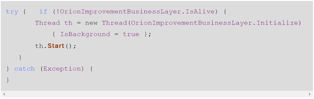 攻撃者自身のコードがもとになってコンパイラが警告を出すと、SolarWindsの開発者に気付かれる可能性があります。こうしたコンパイル警告を削除するため、StellarParticleは#pragma warning disableや#pragma warningといったRESTOREステートメントで編集を行い、編集箇所を示唆しました。具体的には、次のようなtry/catchコードブロックが追加され、正規のOrionソフトウェアのRefreshInternal機能にSUNSPOTのエントリポイントが追加されました。