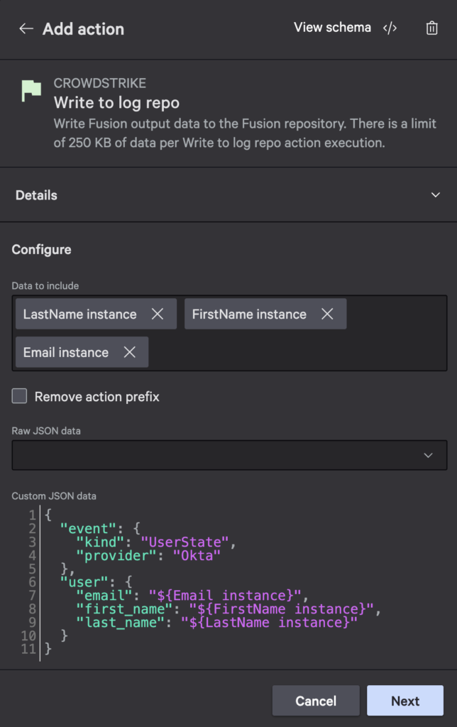 In the Configure section, you can specify individual field data to include. Select LastName, FirstName, and Email instances. Then, define custom JSON data so the result is formatted in a way that’s more conducive to how you want to index it in LogScale.