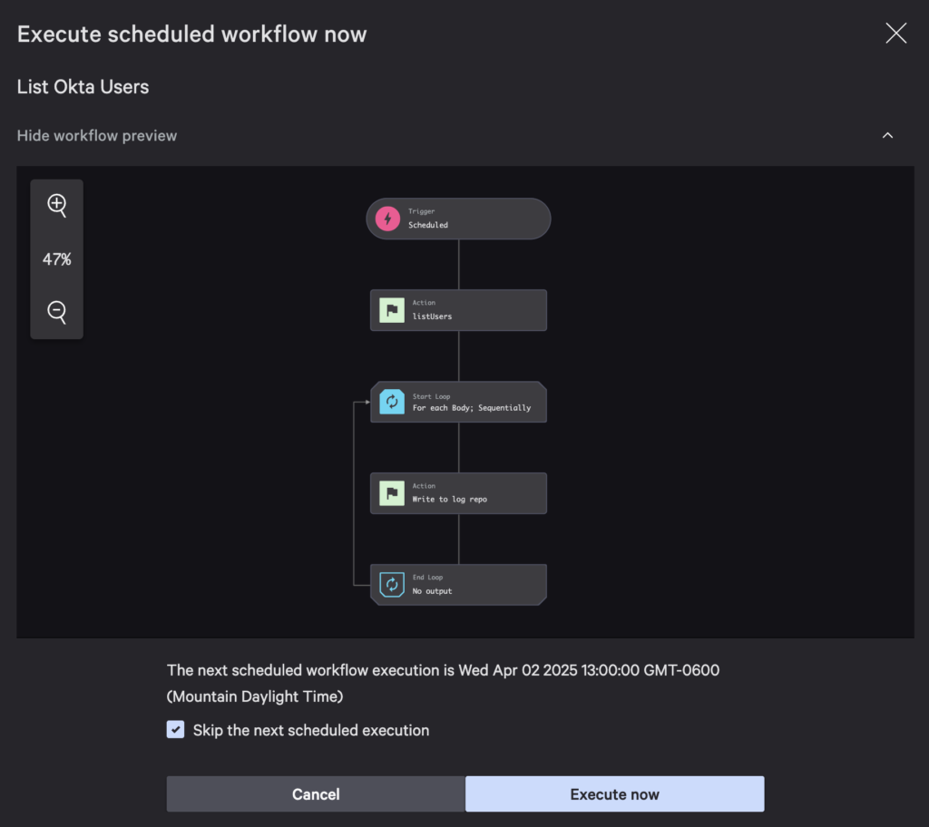 From the workflows list, find List Okta Users and using its actions menu, choose Execute workflow. Skip the next scheduled execution and Execute now. You will see a workflow execution success message with a link to view it.