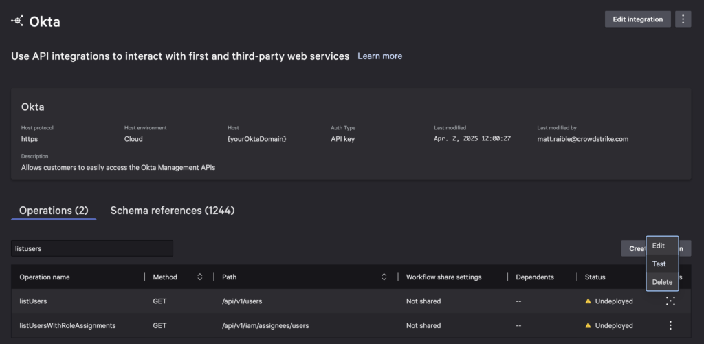 Return to your integration and search for the “deactivateuser” operation. Edit it to share it with Falcon Fusion SOAR and add the Okta tag. You’ll need to trim down the length of the description to be shorter too. After saving, press Done.