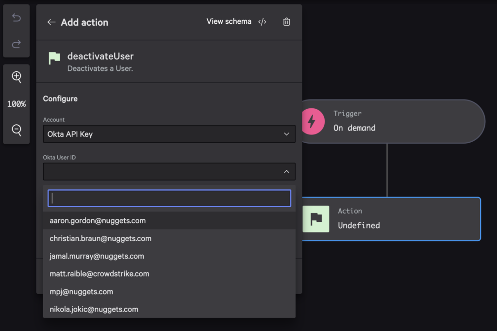 Add a new action and search for the deactivateUser action. Select Okta API Key for the account. Notice how the Okta User ID dropdown auto-completes and shows email addresses.