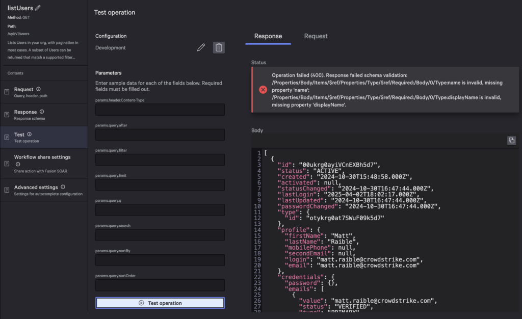 Go back to your Okta Demo app in Foundry and go to its API integration. Search for the “listusers” operation and select its Test action.