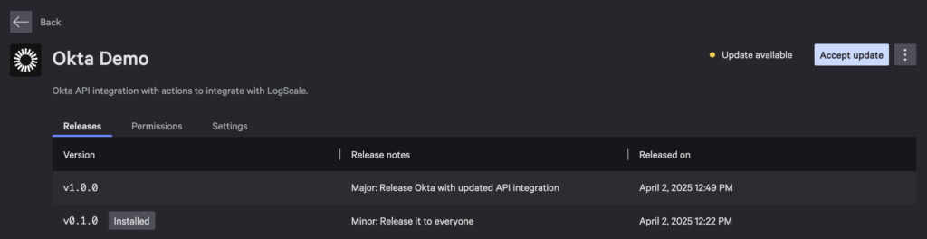 Okta API integration with actions to integrate with LogScale. - App logo: I used the avatar from @oktadev.