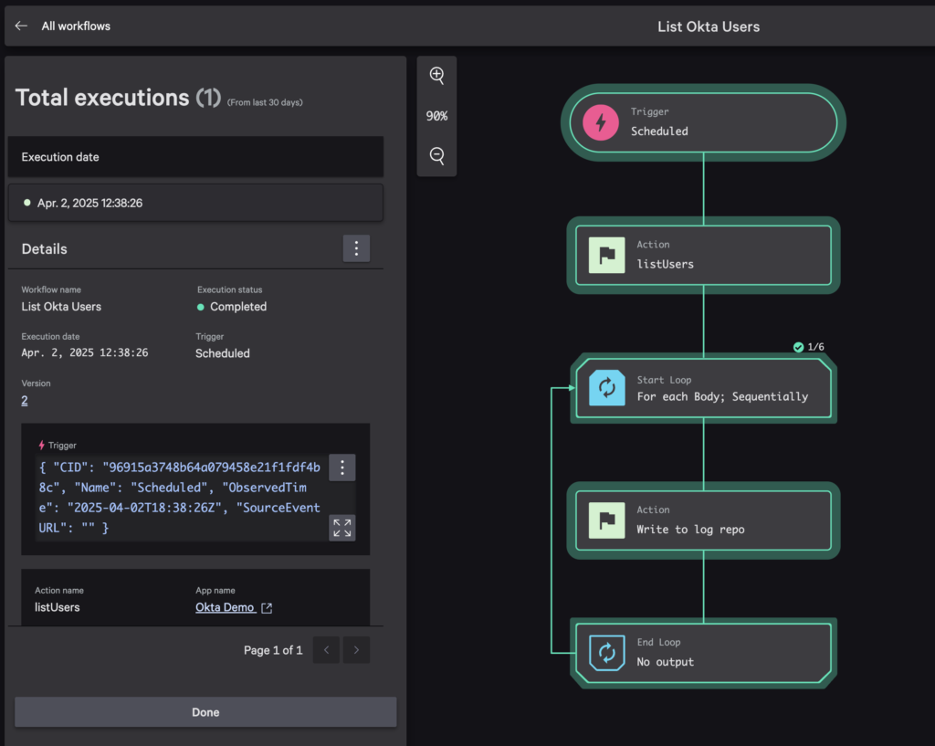 TIP: Make sure to turn off or delete your List Okta Users workflow when you’re finished. Because it’s scheduled to run every hour, you’ll start receiving rate limit warnings from Okta a few days later.