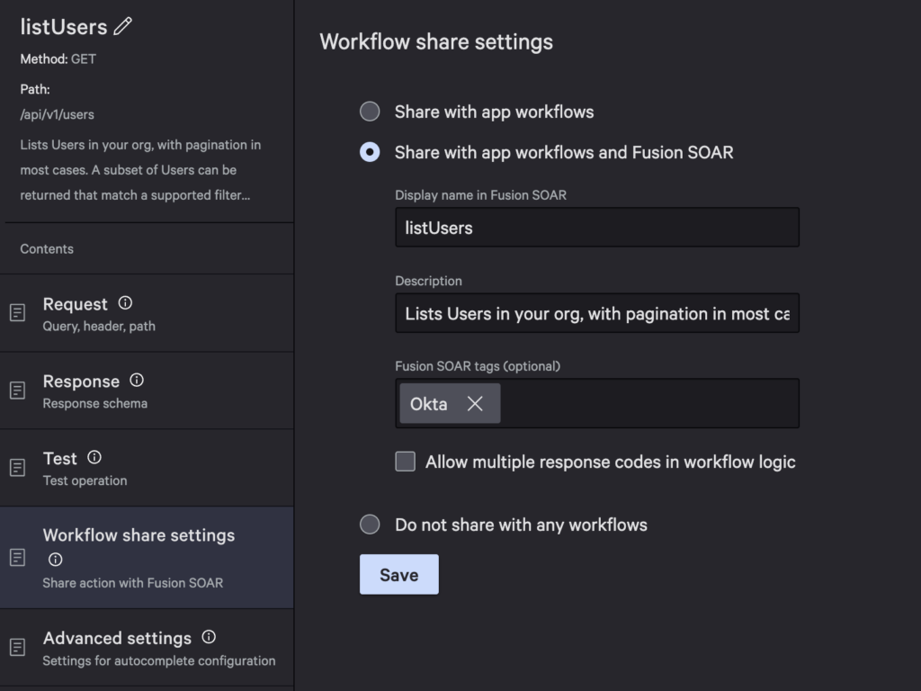 Go to Workflow Share settings to share your action with Falcon Fusion SOAR. Use the defaults for the display name and description. Add Okta as a tag and Save.