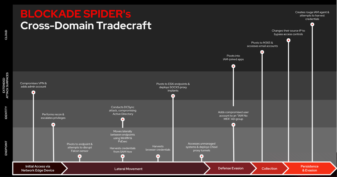 BLOCKADE SPIDER is among the most elusive cross-domain adversaries. This financially motivated eCrime adversary, active since at least April 2024, commonly uses cross-domain techniques in its ransomware campaigns. They gain access through unmanaged systems, dump credentials, and move laterally to virtualized infrastructure to remotely encrypt files with Embargo ransomware. They’ve also demonstrated the ability to target cloud environments.