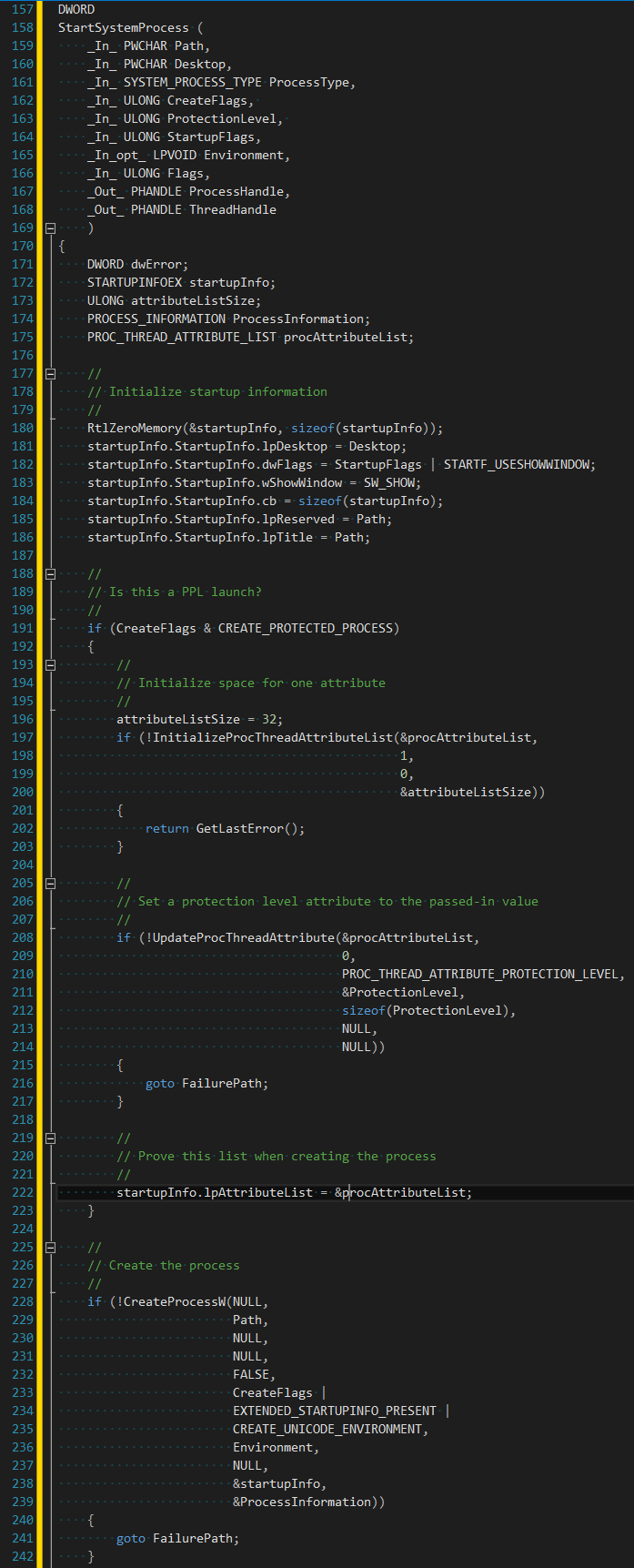 Either way, as long as one of these two things is set (the environment variable or the registry key), ExecSystemProcesses will call StartSystemProcess with the CREATE_PROTECTED_PROCESS flag. In turn, the routine will utilize the new Vista Process/Thread Attribute List functionality to add attribute 0x2000B — documented as the new Windows 8.1 “Protection Level Attribute“. As you can expect, the level is set to 4, which matches the “LSA Signer” enumeration value above. And just like that, LSASS is now a PPL, and protected against even an admin (or even SYSTEM) attacker. And no, not even SE_DEBUG_PRIVILEGE will get you through. Clicking on any of the linked function names will reveal Hex-Rays output to match this flow.