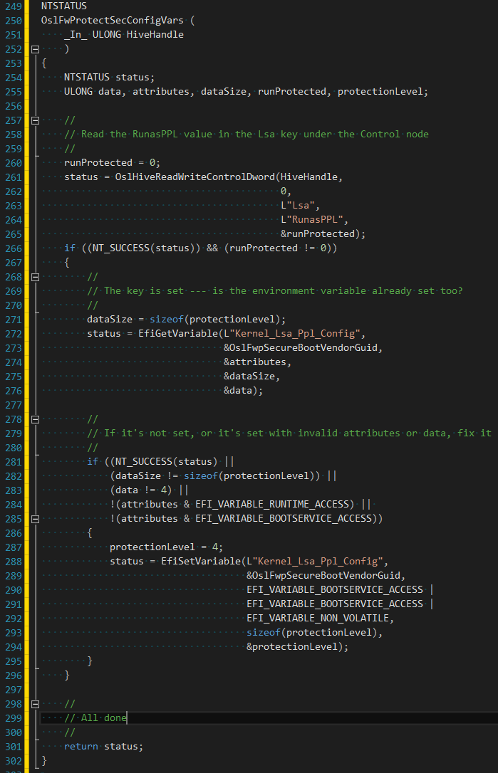 This GUID, {77FA9ABD-0359-4D32-60BD-28F4E78F784B}, is the “Protected Store” that Windows can use to store certain system properties it wants to protect. In this case, it stores a variable named Kernel_Lsa_Ppl_Config that is associated with the RunAsPPL value in the registry (to be 100% accurate, “it” here refers to Winload.efi, which upon loading the registry executes the OslFwProtectSecConfigVars routine). As soon as this variable is set, the registry values no longer matter — PPL is enabled for LSASS.
