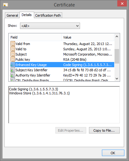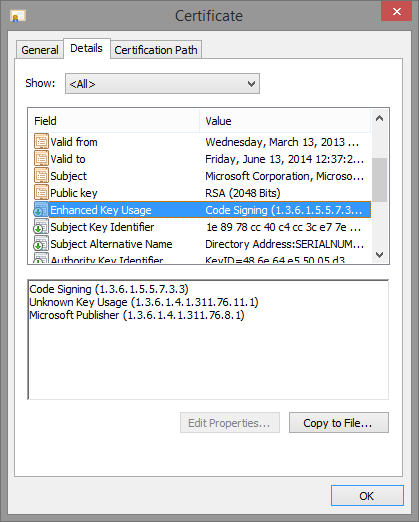 Here’s some screenshots of a few system binaries, which should now reveal familiar EKUs based on what we’ve seen so far.