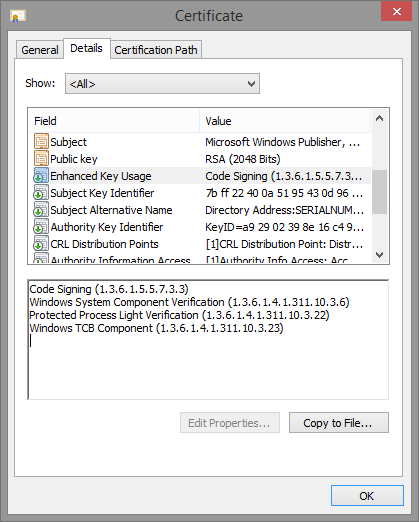 Additionally, a great deal of reliance seems to have been put on EKUs, which were relatively unknown in the past and mostly only used to define a certificate as being for “SSL” vs “Code Signing”. One can only hope that the major CAs are smart enough to have filters in place to avoid arbitrary EKUs being associated with 3rd party Authenticode certificates. Otherwise, as long as a signature level accepts a non-PRS root key, the infrastructure could easilyy be fooled by an EKU that a CA has allowed into a certificate.