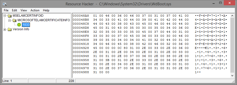 Once SeRegisterElamCertResources is called in either of these cases, it calls SepParseElamCertResources on the MICROSOFTELAMCERTIFICATEINFO section in order to parse an MSELAMCERTINFOID resource. Here is, for example, a screenshot of the resource data matching this name in Microsoft’s Windows Defender ELAM driver (Wdboot.sys):