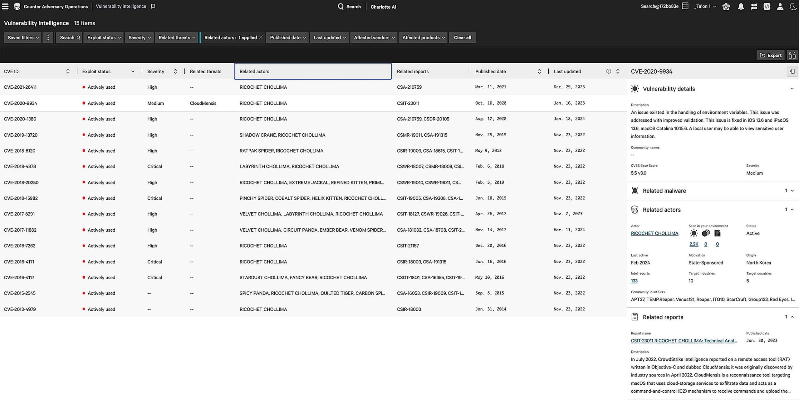 CrowdStrike Falcon® Adversary Intelligence provides detailed profiles of 257 adversaries, including nation-states, eCrime groups, and hacktivists. Each profile breaks down their methods, maps their tactics to the MITRE ATT&CK™ framework, and reveals the vulnerabilities they exploit.