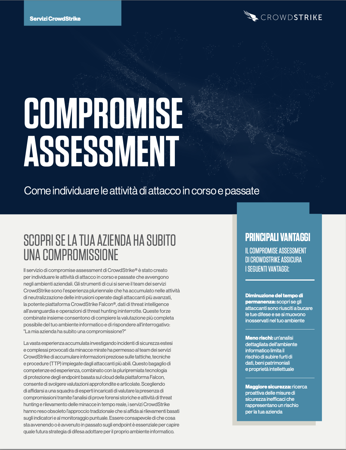 Il servizio di Compromise Assessment di CrowdStrike® è stato creato per individuare le attività di attacco in corso e passate che avvengono negli ambienti aziendali. Gli strumenti di cui si serve il team dei servizi CrowdStrike sono l'esperienza pluriennale che ha accumulato nelle attività di neutralizzazione delle intrusioni operate dagli attaccanti più avanzati, la potente piattaforma CrowdStrike Falcon®, dati di threat intelligence all'avanguardia e operazioni di threat hunting ininterrotte. Queste forze combinate insieme consentono di compiere la valutazione più completa possibile del tuo ambiente informatico e di rispondere all'interrogativo: "La mia azienda ha subito una compromissione?"
