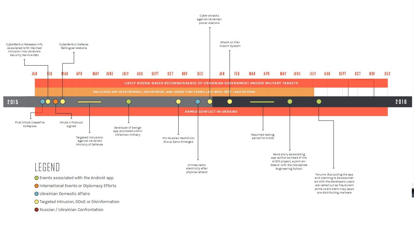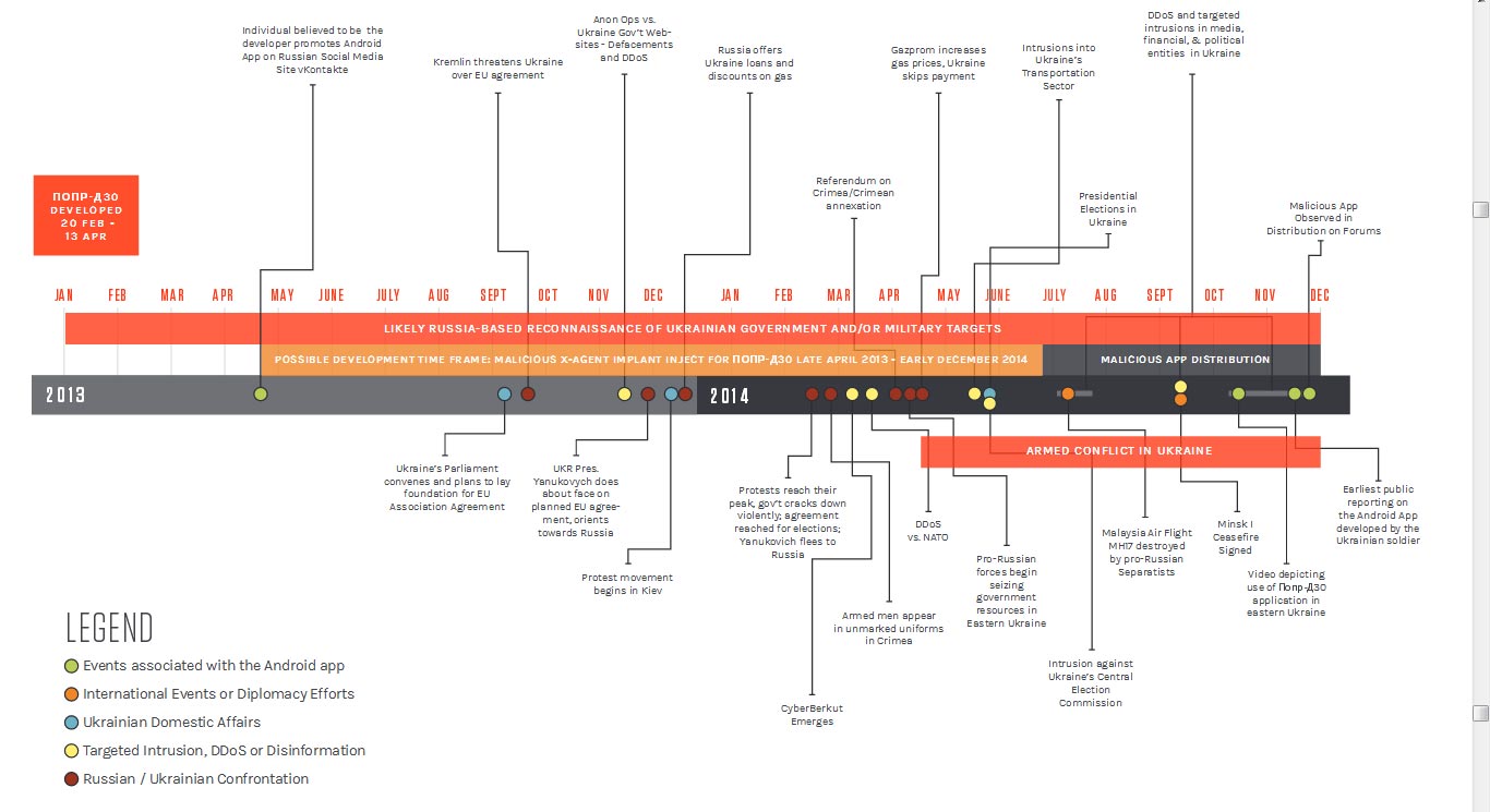 MARCH 2017 UPDATE: The information about the combat losses of the D-30 artillery units suffered by Ukrainian forces has been updated with the latest analysis from Henry Boyd, International Institute for Strategic Studies (IISS) Research Associate for Defence and Military Analysis. KEY POINTS From late 2014 and through 2016, FANCY BEAR X-Agent implant was covertly distributed on Ukrainian military forums within a legitimate Android application developed by Ukrainian artillery officer Yaroslav Sherstuk. The original application enabled artillery forces to more rapidly process targeting data for the Soviet-era D-30 Howitzer employed by Ukrainian artillery forces reducing targeting time from minutes to under 15 seconds. According to Sherstuk’s interviews with the press, over 9000 artillery personnel have been using the application in Ukrainian military. Successful deployment of the FANCY BEAR malware within this application may have facilitated reconnaissance against Ukrainian troops. The ability of this malware to retrieve communications and gross locational data from an infected device makes it an attractive way to identify the general location of Ukrainian artillery forces and engage them. According to an update provided in March 2017 by the International Institute for Strategic Studies (IISS) Research Associate for Defence and Military Analysis, Henry Boyd, “excluding the Naval Infantry battalion in the Crimea which was effectively captured wholesale, the Ukrainian Armed Forces lost between 15% and 20% of their pre-war D–30 inventory in combat operations.” This previously unseen variant of X-Agent represents FANCY BEAR’s expansion in mobile malware development from iOS-capable implants to Android devices, and reveals one more component of the broad spectrum approach to cyber operations taken by Russia-based actors in the war in Ukraine. The collection of such tactical artillery force positioning intelligence by FANCY BEAR further supports CrowdStrike’s previous assessments that FANCY BEAR is likely affiliated with the Russian military intelligence (GRU), and works closely with Russian military forces operating in Eastern Ukraine and its border regions in Russia. BACKGROUND In late June and August 2016, CrowdStrike Intelligence provided initial reporting and technical analysis of a variant of the FANCY BEAR implant X-Agent that targeted the Android mobile platform2. CrowdStrike identified this X-Agent variant within a legitimate Android application named Попр-Д 30.apk. This app was developed and used by artillery troops to simplify targeting data for the D-30 towed howitzer. CrowdStrike investigation reveals that this app has been utilized in a possible training or operational role in at least one unit of the Ukrainian military. Therefore, the implant likely targeted military artillery units operating against pro-Russian separatists in Eastern Ukraine. This implant represents further advancements in FANCY BEAR’s development of mobile malware for targeted intrusions and extends Russian cyber capabilities to the front lines of the battlefield. This Tipper builds on CrowdStrike’s previous reporting by providing a timeline of events, contextual discussion regarding the potential drivers for development and deployment of the malware, and a description of the analytical process resulting in targeting assessments. Finally, this Tipper leverages these assessments, in conjunction with more recently observed activity by Russia-based adversaries, to determine the potential for any future activity in the mobile malware threat space. TIMELINE OF EVENTS DEVELOPMENT AND DISTRIBUTION PROCESS OF THE BENIGN APPLICATION The original application central to this discussion, Попр-Д30.apk, was initially developed domestically within Ukraine by a member of the 55th Artillery Brigade. Based on the file creation timestamps as well as the app signing process, which occurred on 28 March 2013, CrowdStrike has determined that the app was developed sometime between 20 February and 13 April 2013. Shortly after that time frame, on 28 April 2013, an individual bearing the same name as the application’s developer promoted the application on Russian vKontakte3 pages associated with the artillery forces. The promotion of the program was likely limited to social media, and the distribution was controlled from the author’s main page, «Програмное обеспечение современного боя» (translation: “Modern combat software”).4 As an additional control measure, the program was only activated for use after the developer was contacted and issued a code to the individual downloading the application. No evidence of the application has been observed on the Android app store, making it unlikely that the app was distributed via that platform. The control measures established by the developer to limit the use and proliferation of the Попр-Д30.apk application, coupled with its unique purpose, make its broad distribution on the Android store improbable. At the time of this writing, it is unclear to what degree and for how long this specific application was utilized by the entirety of the Ukrainian Artillery Forces. Based on open source reporting, social media posts, and video evidence, CrowdStrike assesses that Попр-Д30.apk was potentially used through 2016 by at least one artillery unit operating in eastern Ukraine. RECONNAISSANCE, DEVELOPMENT AND DISTRIBUTION OF THE MALICIOUS APPLICATION RECONNAISSANCE Given the estimated development timeframe and the promotional period for the benign Попр-Д30.apk application, the program was likely available online for distribution after late April 2013. CrowdStrike Intelligence assesses that the application likely came to the attention of Russia-based adversaries around this time frame as a result of ongoing Russian reconnaissance associated with the revolution in Ukraine. Actors with a nexus to Russia regularly monitor socia