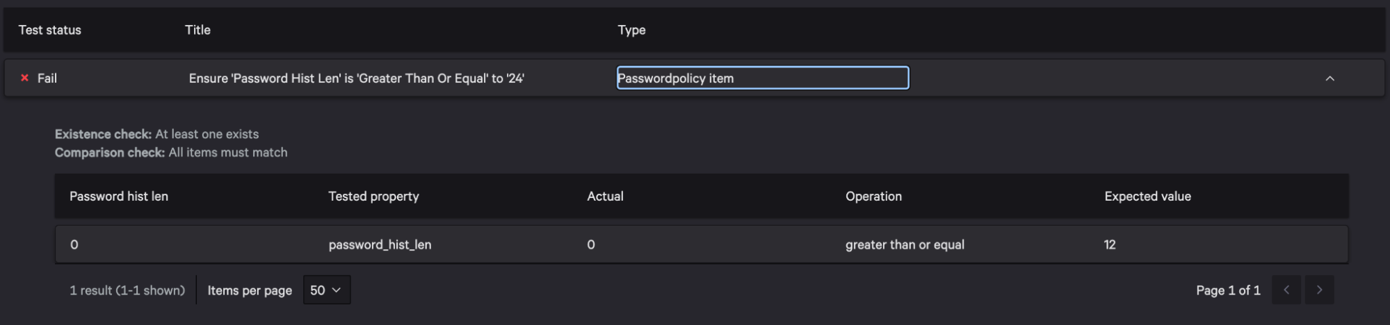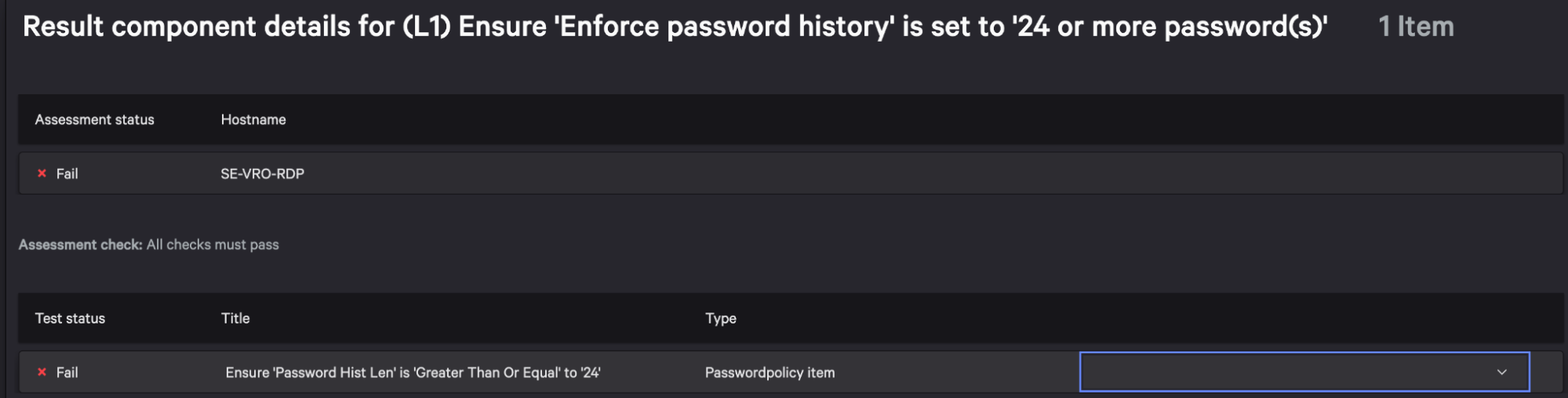 With the current password history length being set to “0” a failed assessment is reported helping to close the investigation.