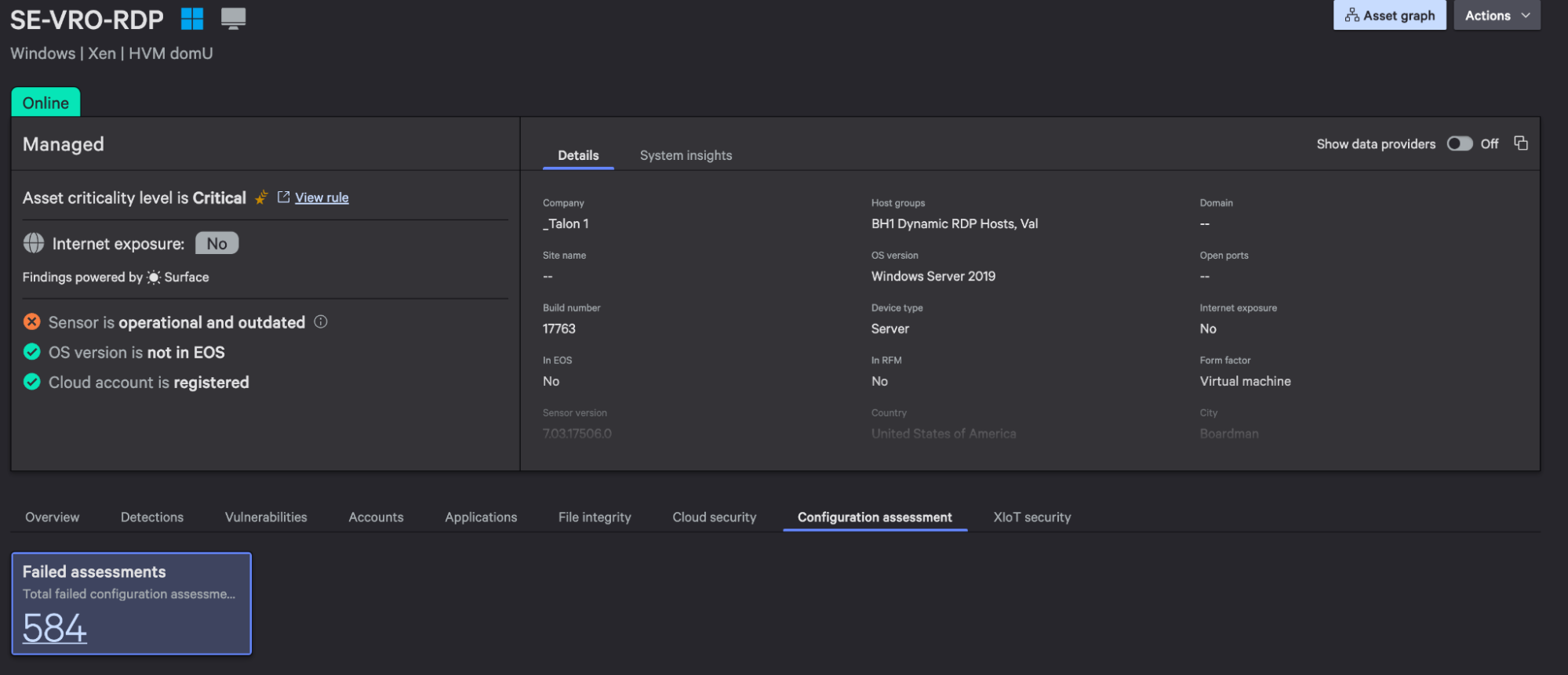 The asset details page consolidates details from across your Falcon subscriptions about assets in your environment. If you have active discovery and third-party integrations set up, that data appears here, too.