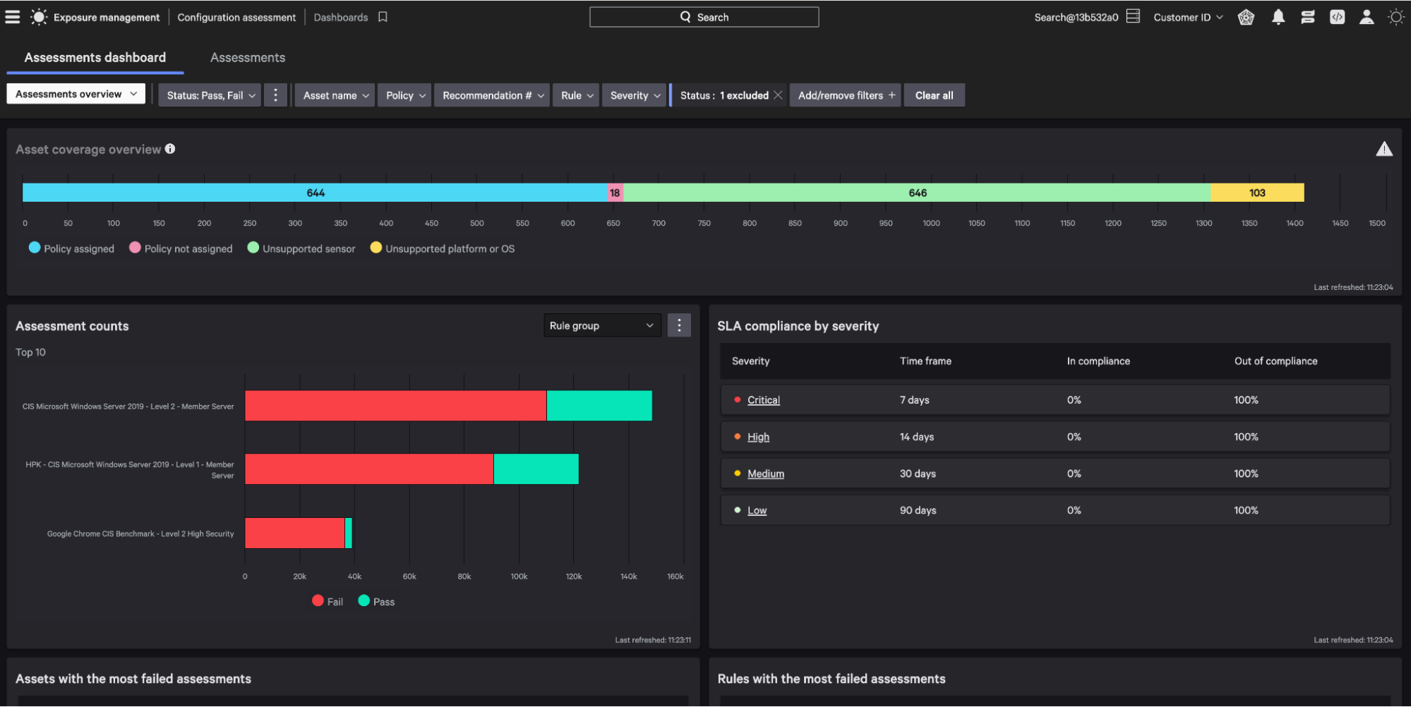 Investigating misconfigured assets begins with the Assessment dashboard which delivers a consolidated snapshot of Asset Coverage, Assessment results, SLA compliance and more – highlights the urgency of any needed remediation.