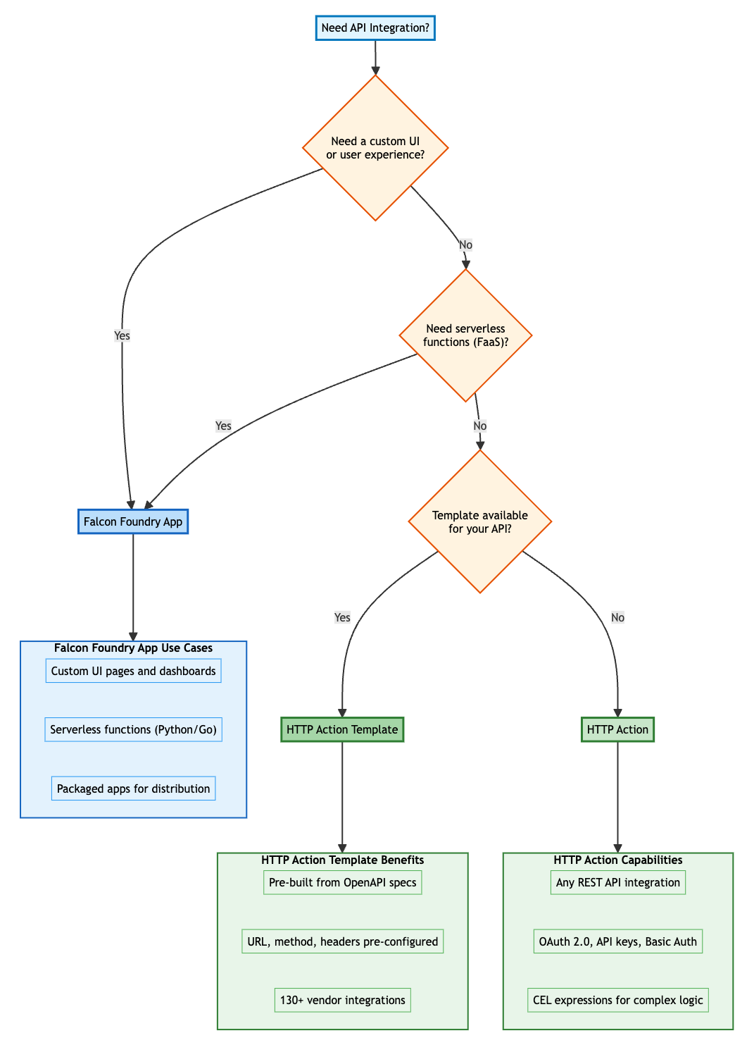 HTTP Actions handle the vast majority of API integration needs, from simple API key authentication to complex OAuth 2.0 flows, with advanced error handling and CEL expressions for complex logic. You only need a Falcon Foundry app when you want a custom UI experience or need serverless functions.