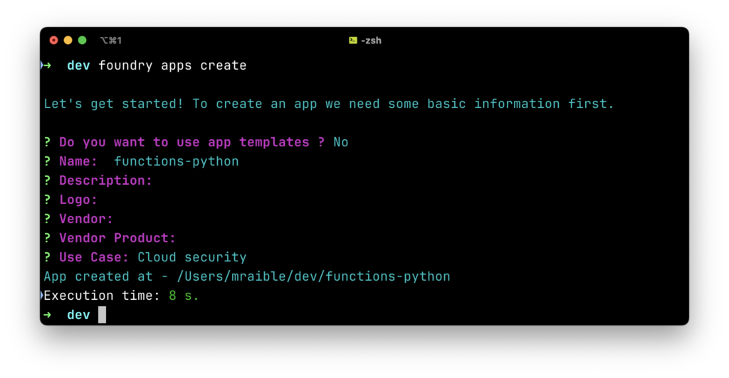 This command won’t work unless you’re inside a Falcon Foundry application. To create one for this tutorial, create an app with foundry apps create: