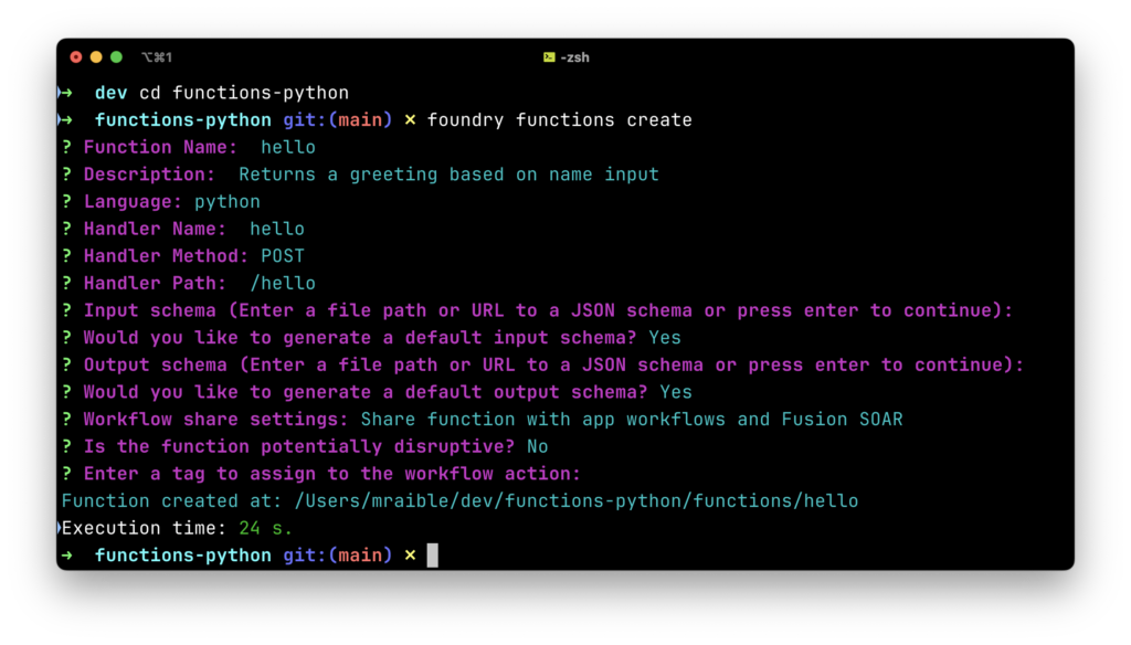 Navigate into the functions-python directory and create your first function with foundry functions create: