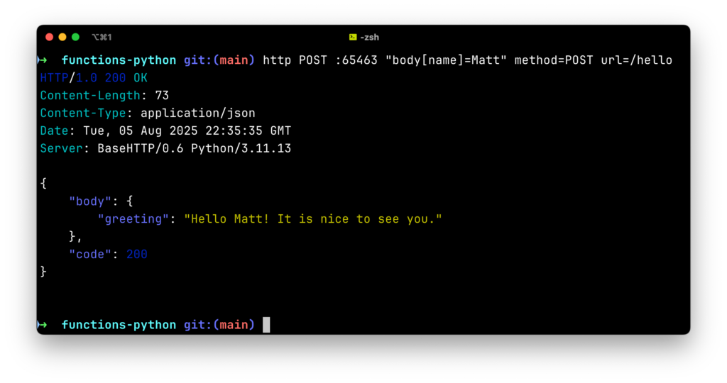 If you don’t have Docker (or a Docker alternative) installed, you can simply run the main.py file from the functions/hello directory:
