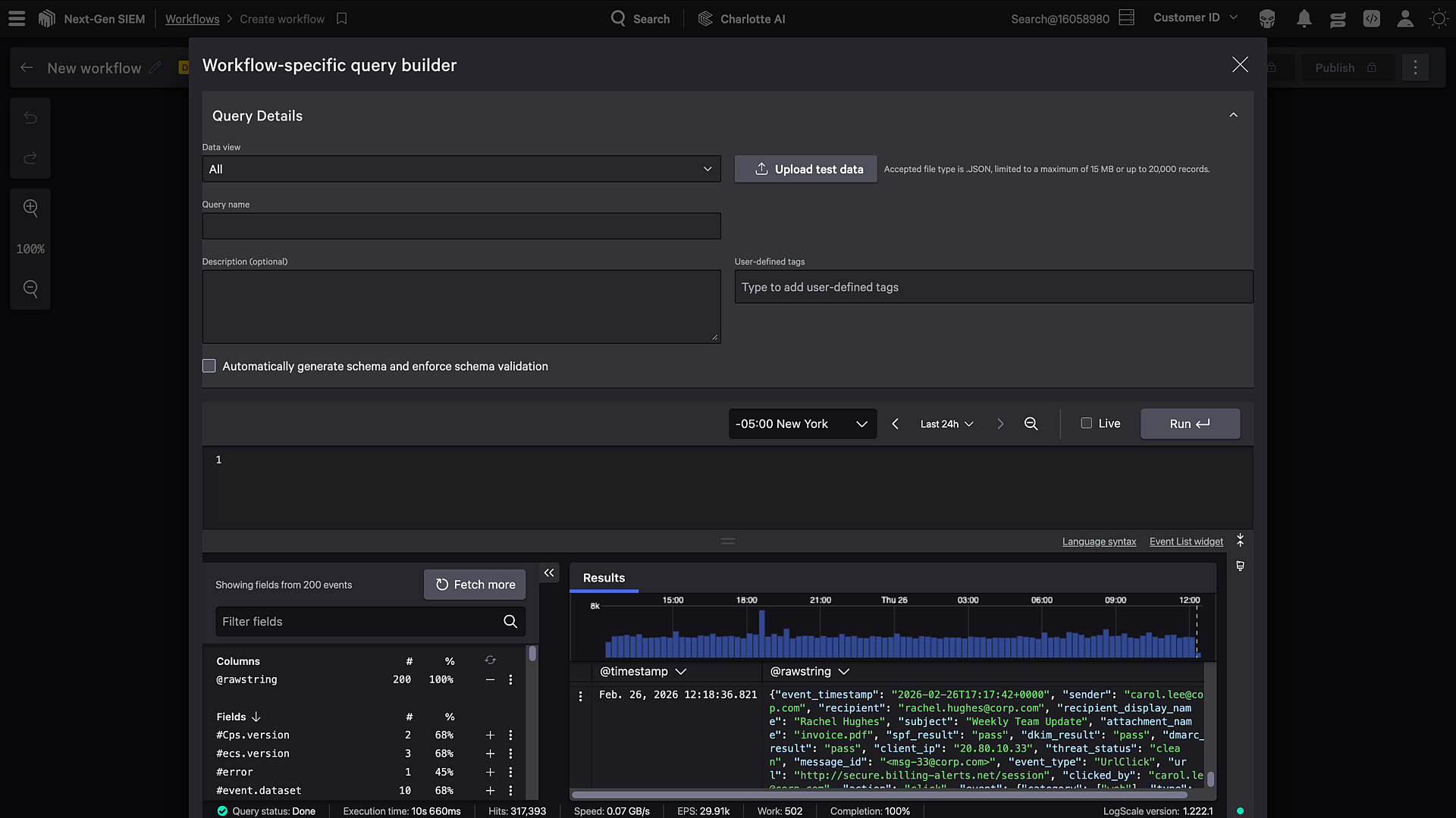 After the schemaless query, you might add a Charlotte AI action to summarize the detection data. Since Charlotte AI can handle variable input structures, it’s a natural fit for processing schemaless query results.