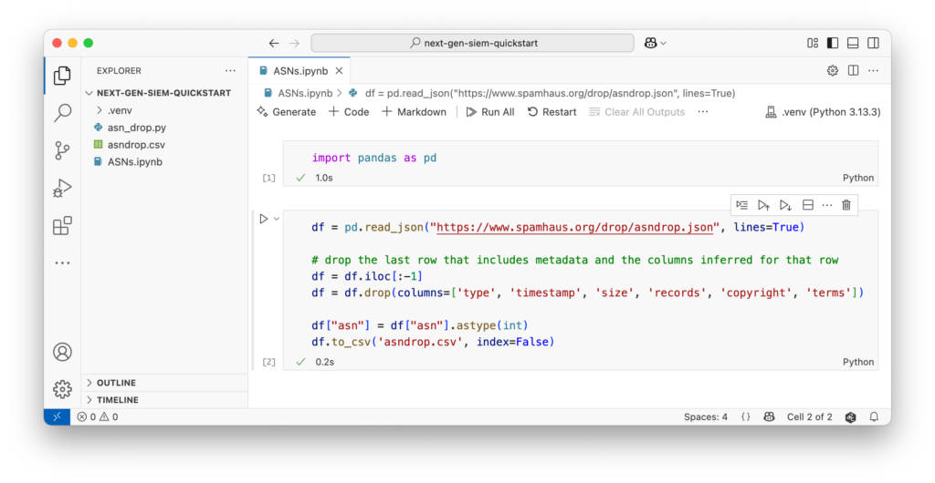 When the command executes successfully, you’ll see a asndrop.csv file in the next-gen-siem-quickstart directory. This process will take several seconds to complete.