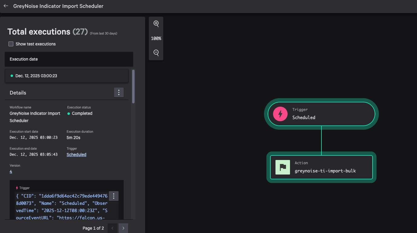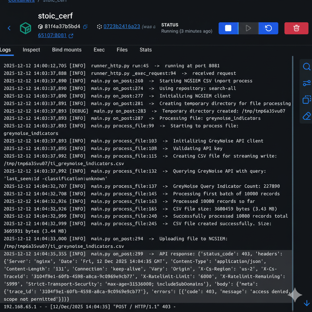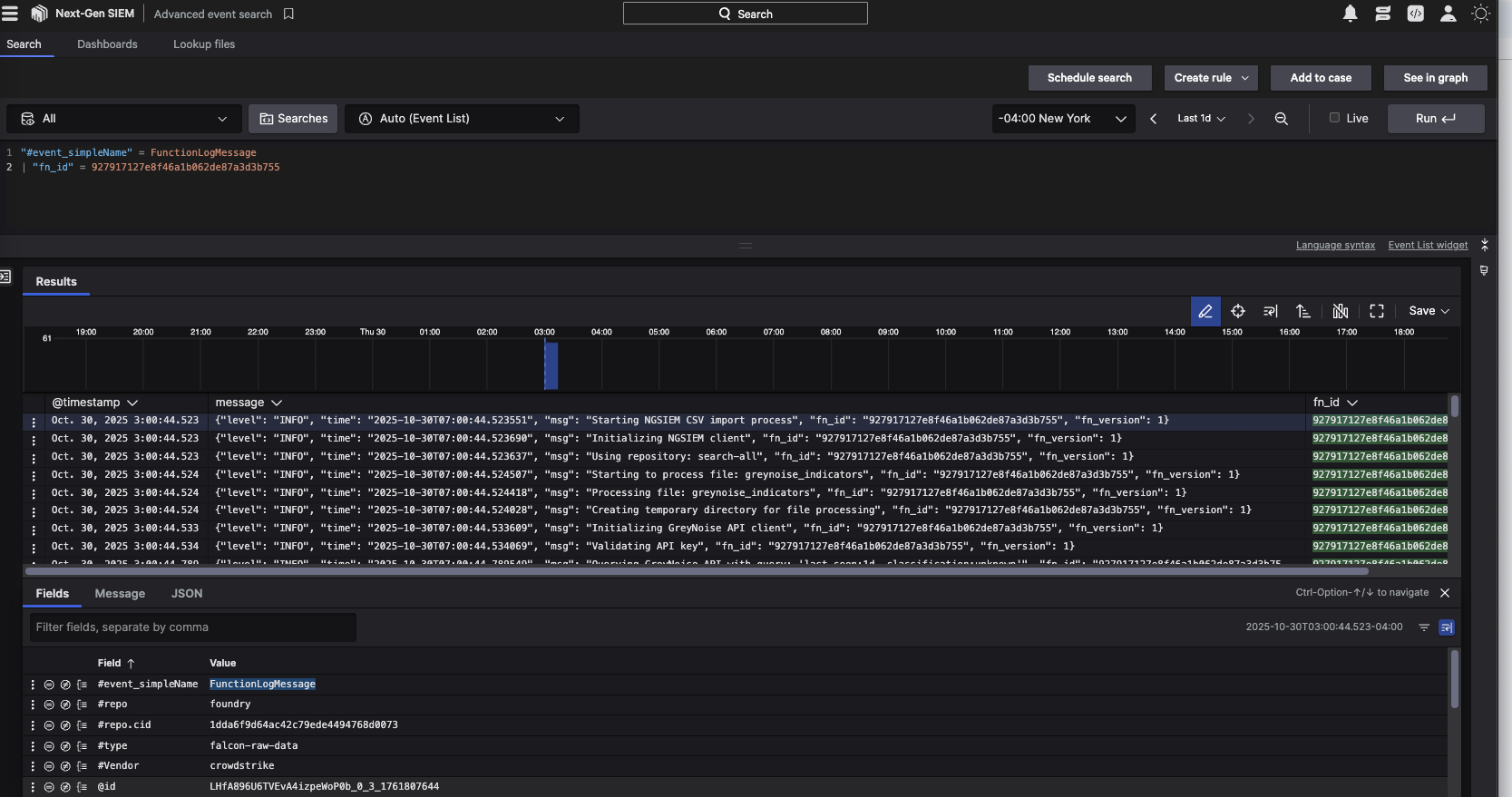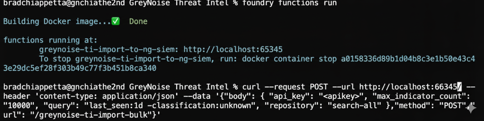 Once we built out the basic app information, it was time to develop what CrowdStrike defines as a function. This function is the core of the integration and took the most work to test and develop thoroughly. In the end, it provides the necessary components to interact directly with the GreyNoise API, download the required indicator information, format the data correctly to be supported as a Falcon Next-Gen SIEM lookup, then finally submit it to Falcon Next-Gen SIEM via the platform Lookup File Upload API.