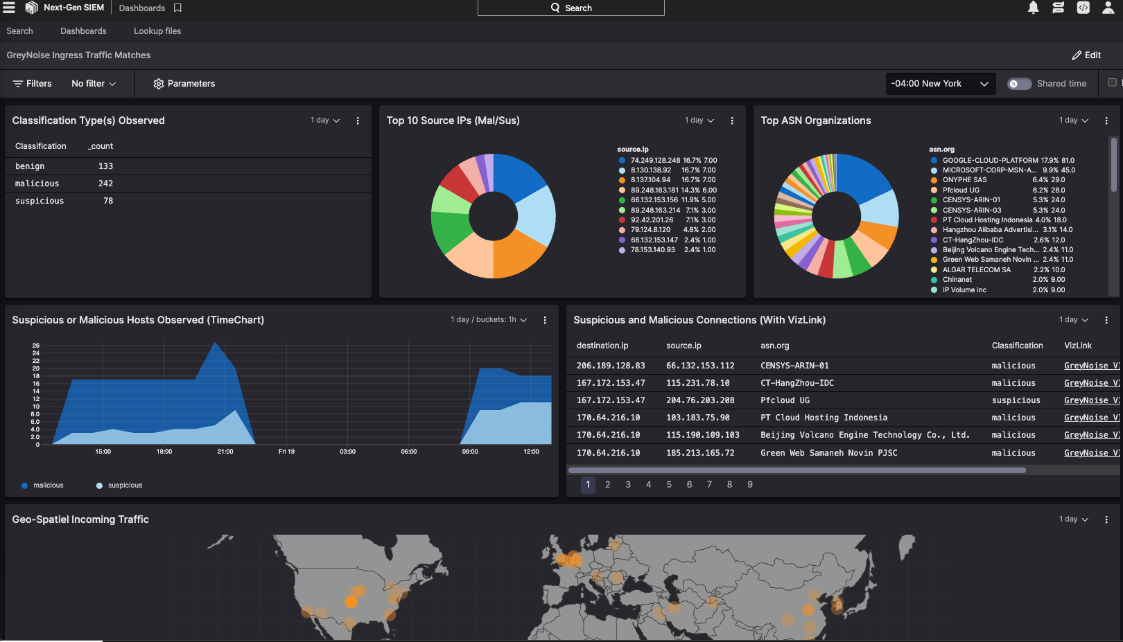 A sample dashboard based on GreyNoise Intel enrichment used to match with ingress traffic