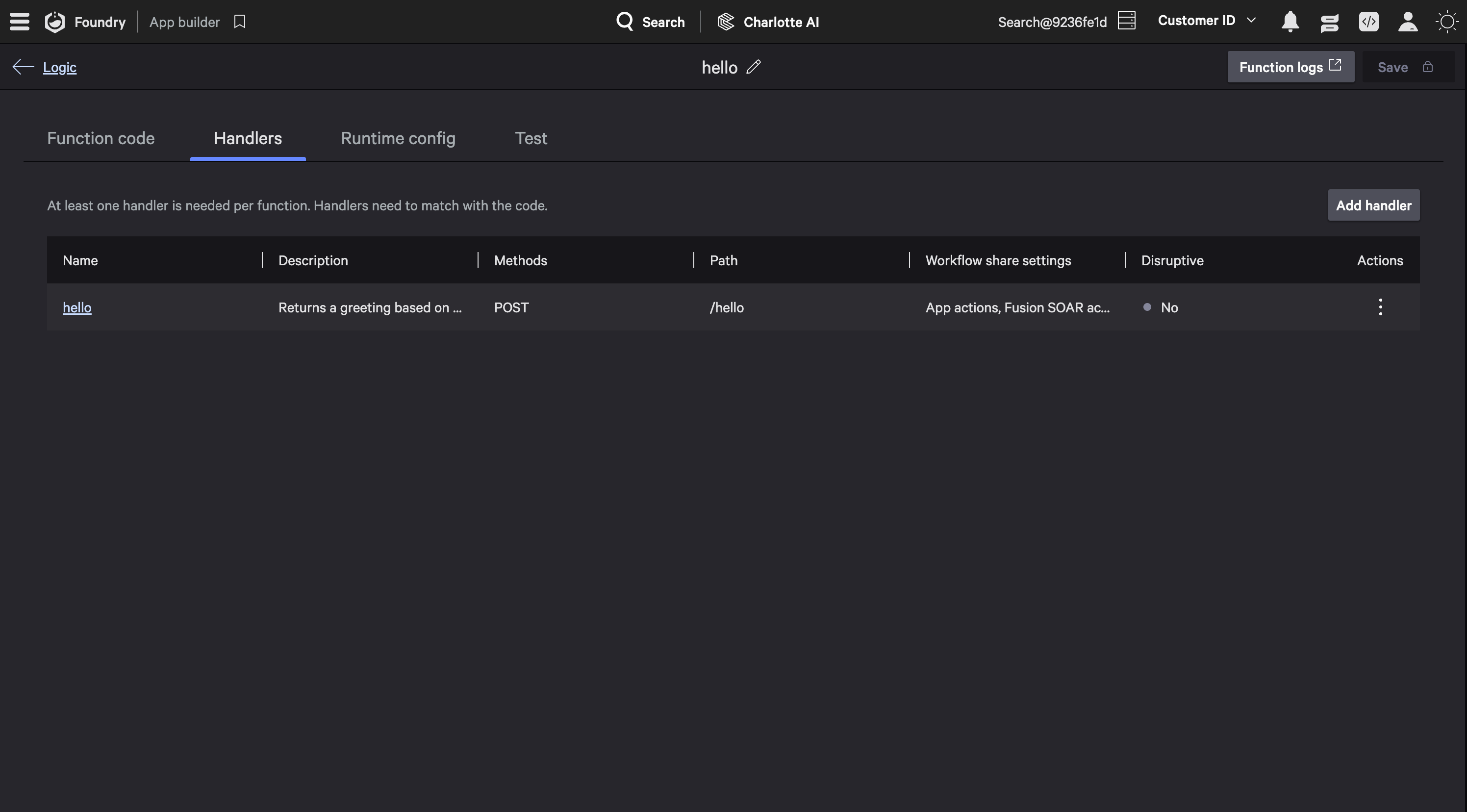 One option worth knowing about: the Share with workflows toggle lets Falcon Fusion SOAR workflows call your handler directly. If you enable this, the handler name you configure here becomes the action name in workflows, so use something unique and descriptive to make it easy to find in the “Add Action” dialog. If you’re building functions that other teams will invoke from automated workflows, enable this for the relevant handlers.