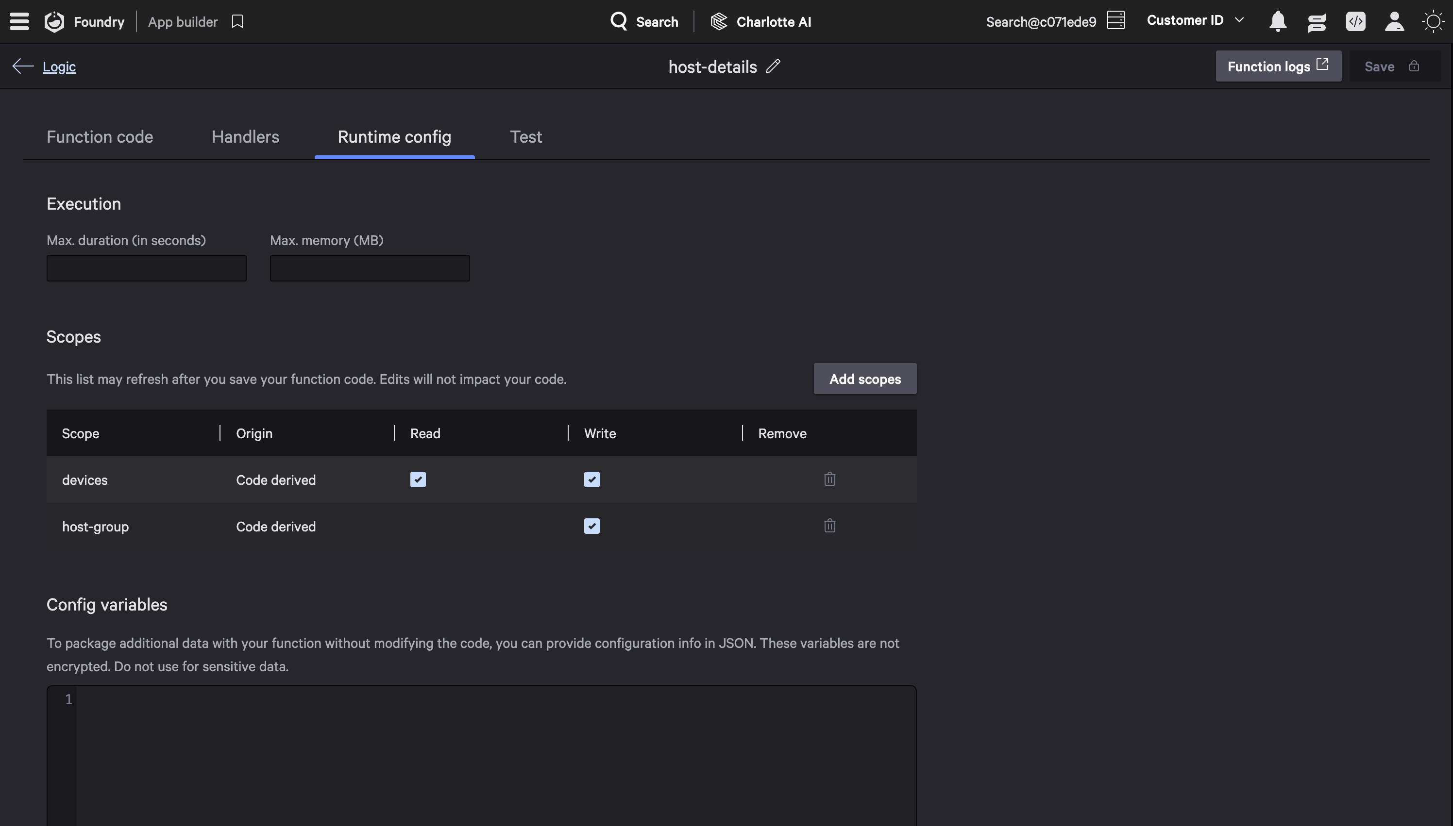 When you import a FalconPy service class, the editor automatically detects which API scopes your function needs. Open the Runtime Config tab on the host-details function, and you’ll see devices and host-group listed with an origin of “Code derived.” The editor figured this out from the from falconpy import Hosts line in your code. The detection works at the import level, so it includes scopes for every method the Hosts class provides, not just the ones your code actually calls.
