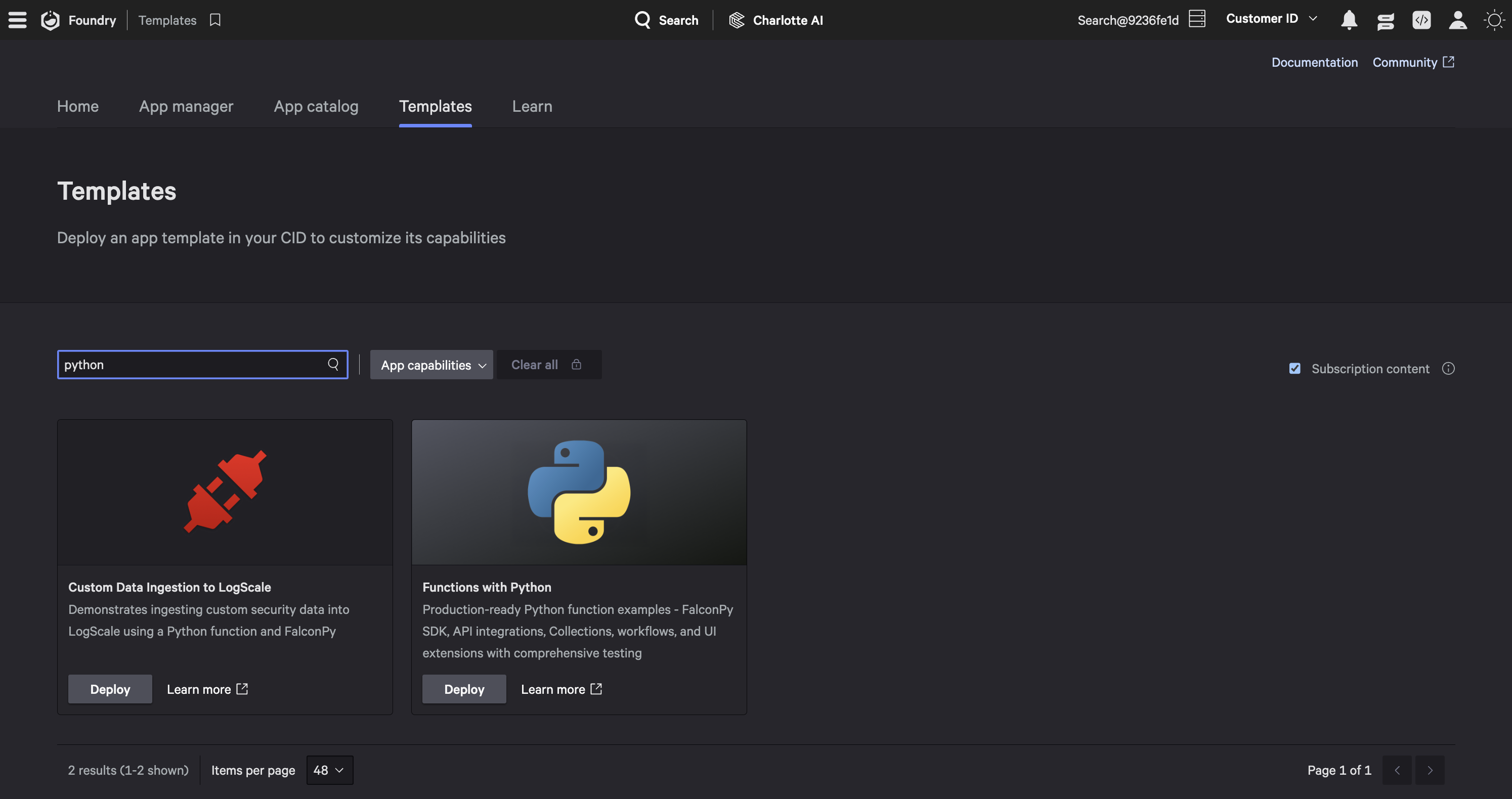 To follow along, deploy the sample app from Templates. In the Falcon console, navigate to Foundry > Templates and search for “python” to narrow the results. Find Functions with Python and click Deploy.