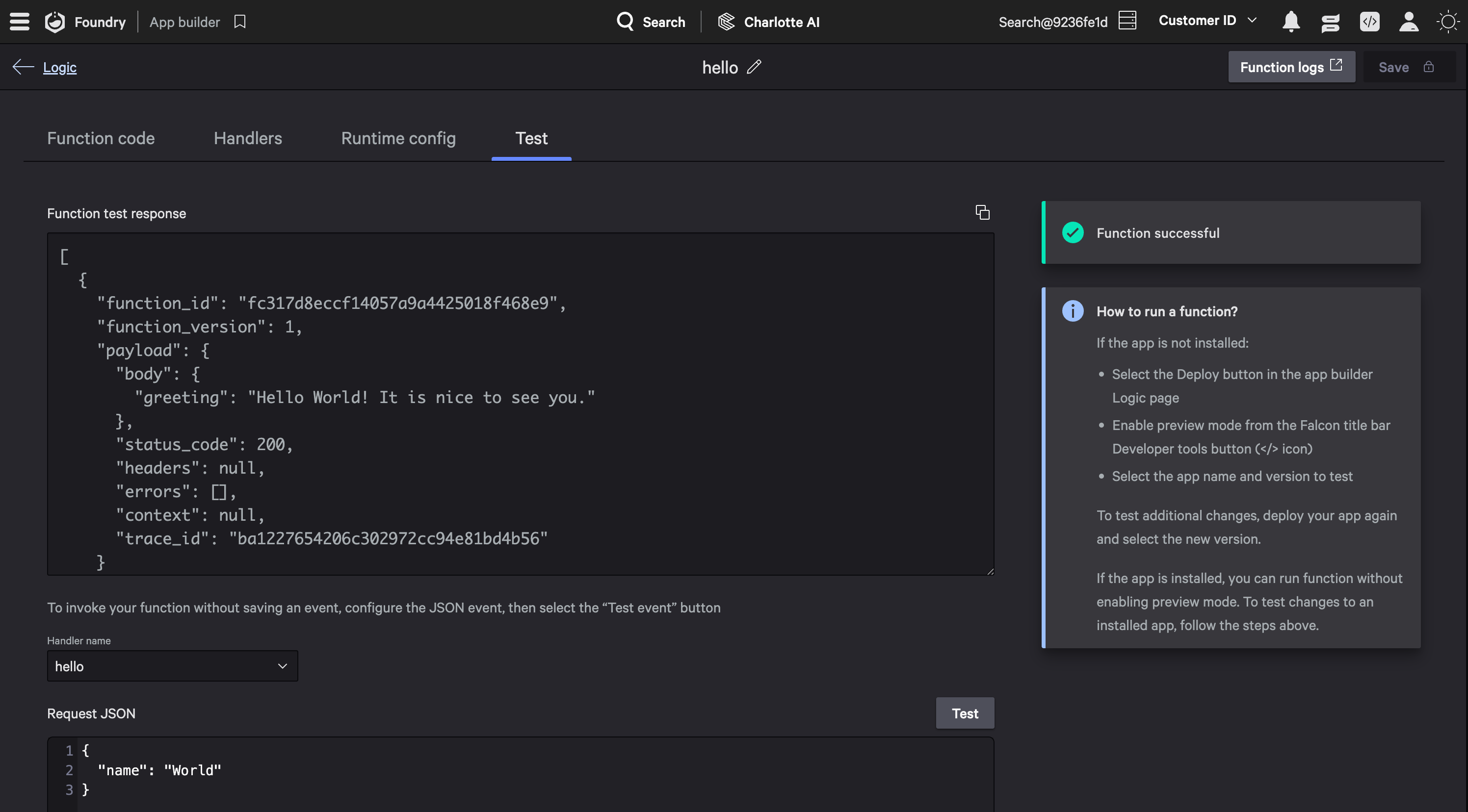 For apps that aren’t installed yet, enable Preview mode by going to Developer tools (the </> icon) > Preview mode, selecting your app and version. Then navigate back to the function and use the Test tab to send a request. For the hello function, you’d send: