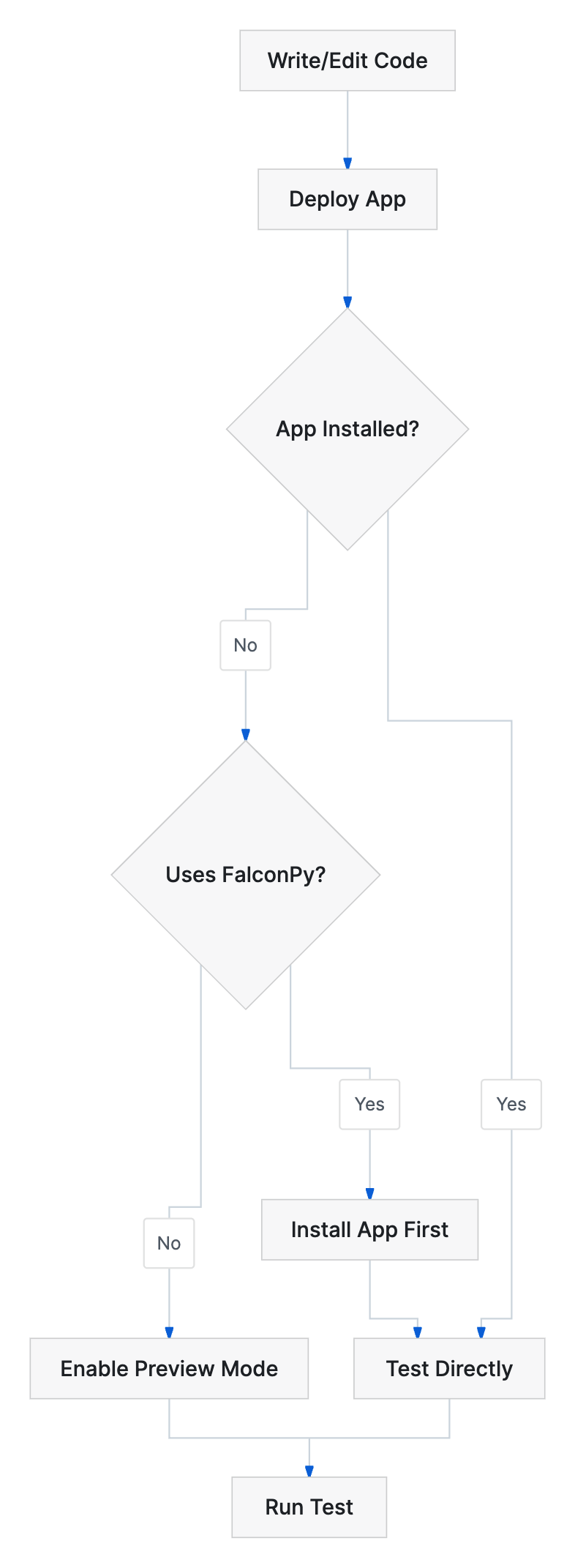 Testing requires a specific sequence. First, you must Deploy the app. There’s no way to test before deployment since the function needs to be running in the Falcon cloud.